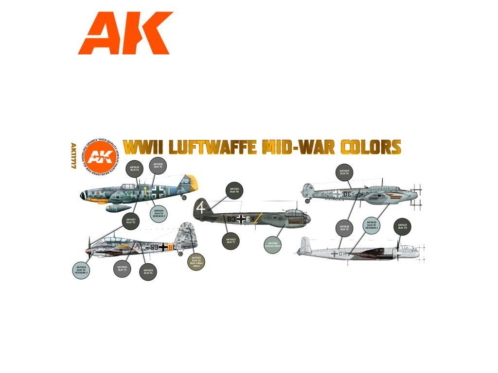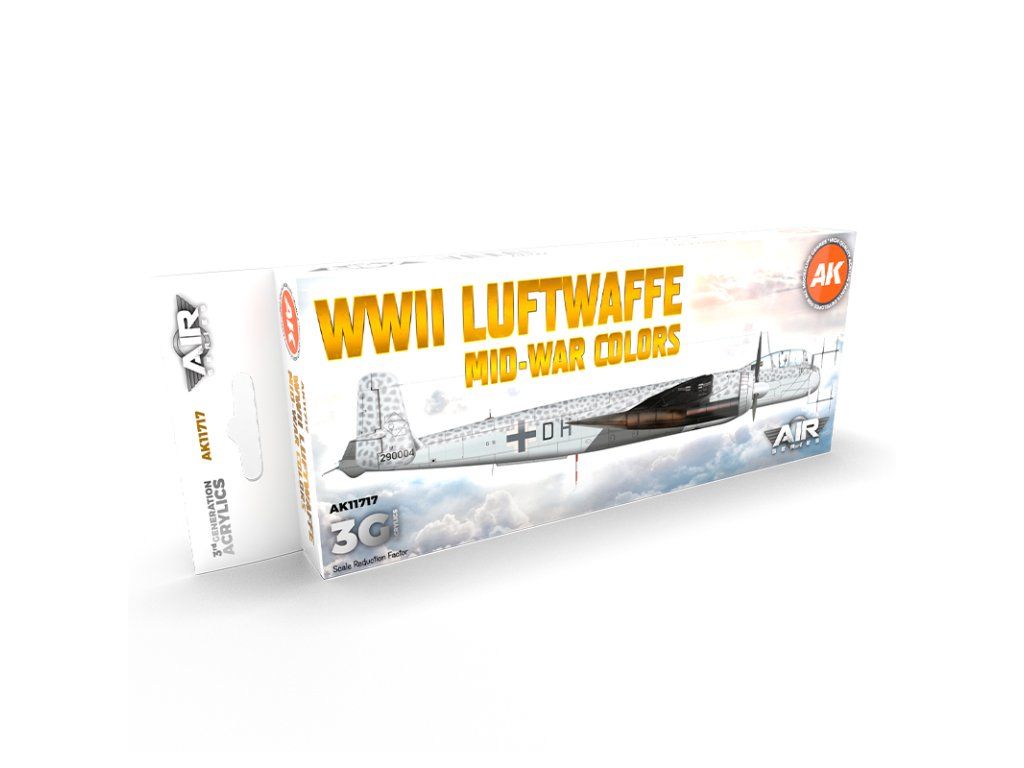 Sada akrylových barev AK-Interactive 3. generace vhodných pro stříkání airbrushem nebo malování štětcem. Sada je vhodná k namalování ale nastříkání německých letadel ze střední fáze druhé světové války.