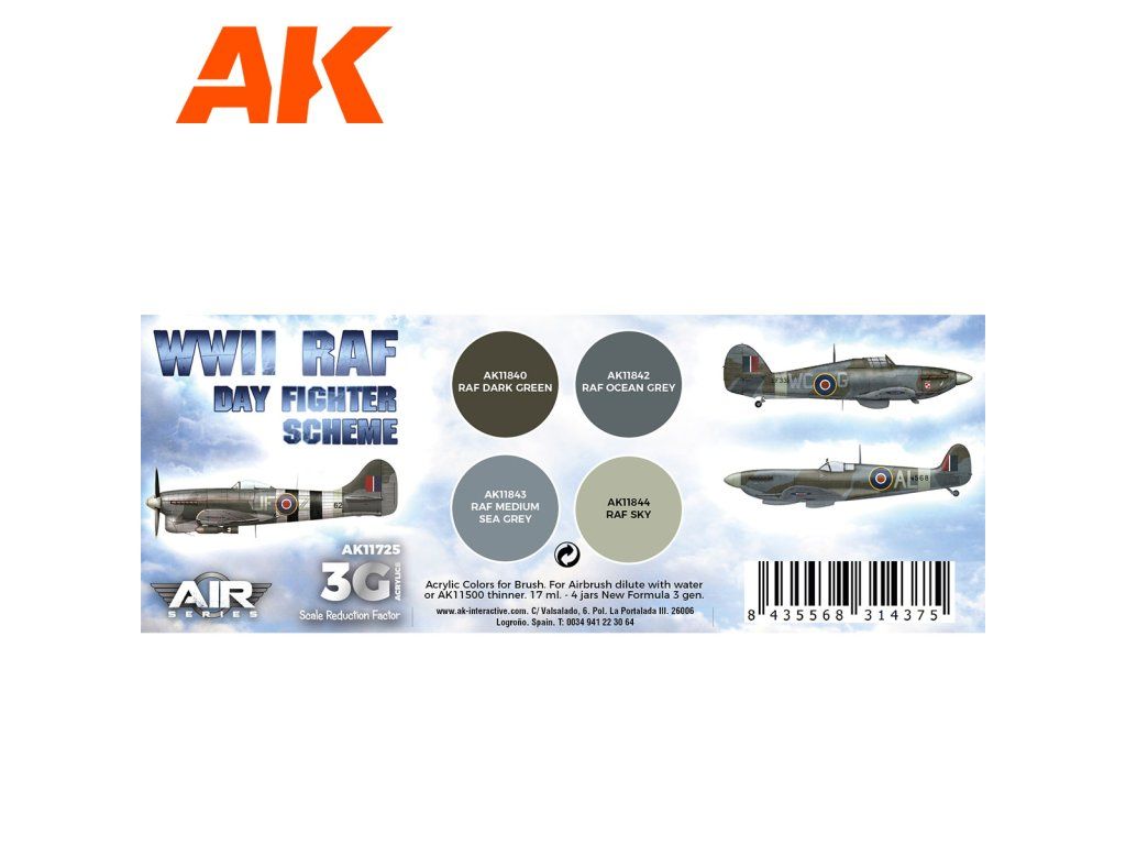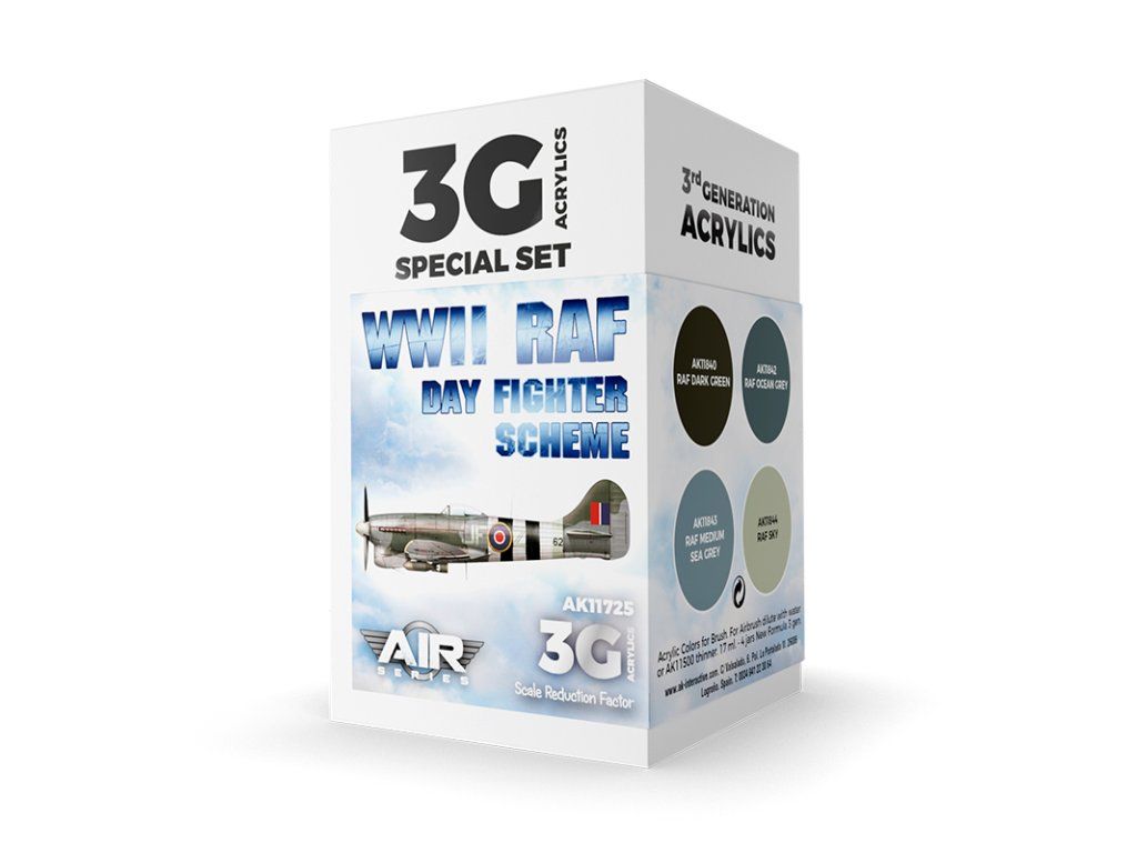Sada akrylových barev AK-Interactive 3. generace vhodných pro stříkání airbrushem nebo malování štětcem. Sada je vhodná k namalování ale nastříkání britských letadel RAF používaných během druhé světové války.