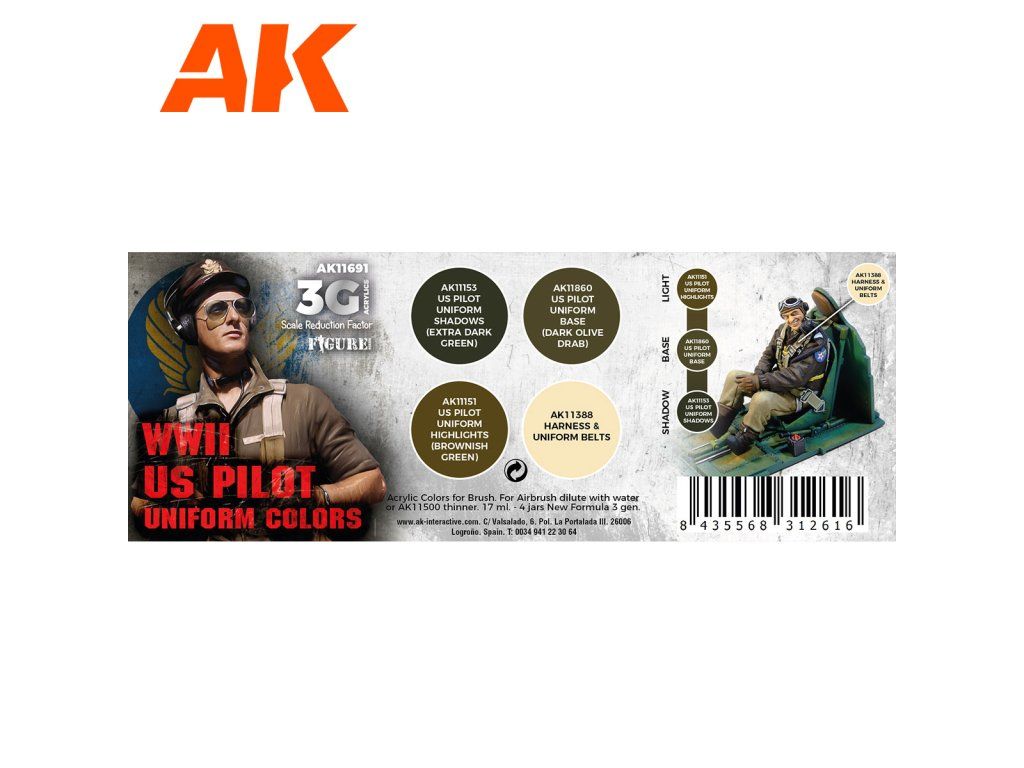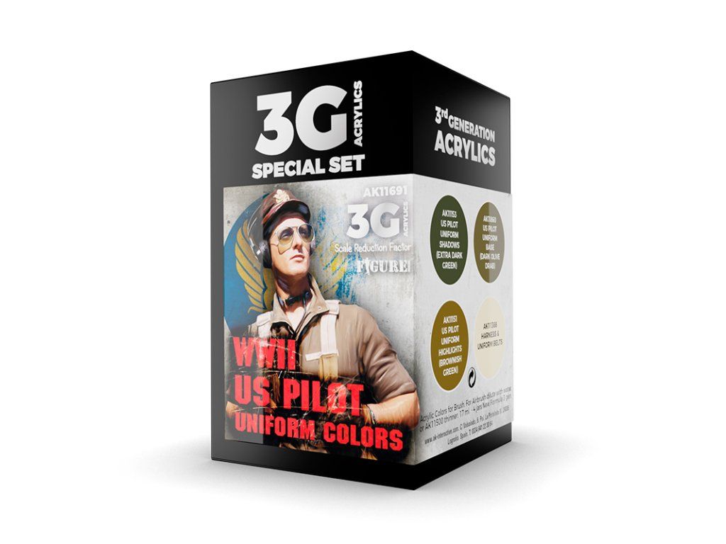Sada akrylových barev AK-Interactive 3. generace vhodných pro stříkání airbrushem nebo malování štětcem. Sada je vhodná pro namalování ale nastříkání figurek amerických pilotů z druhé světové války.