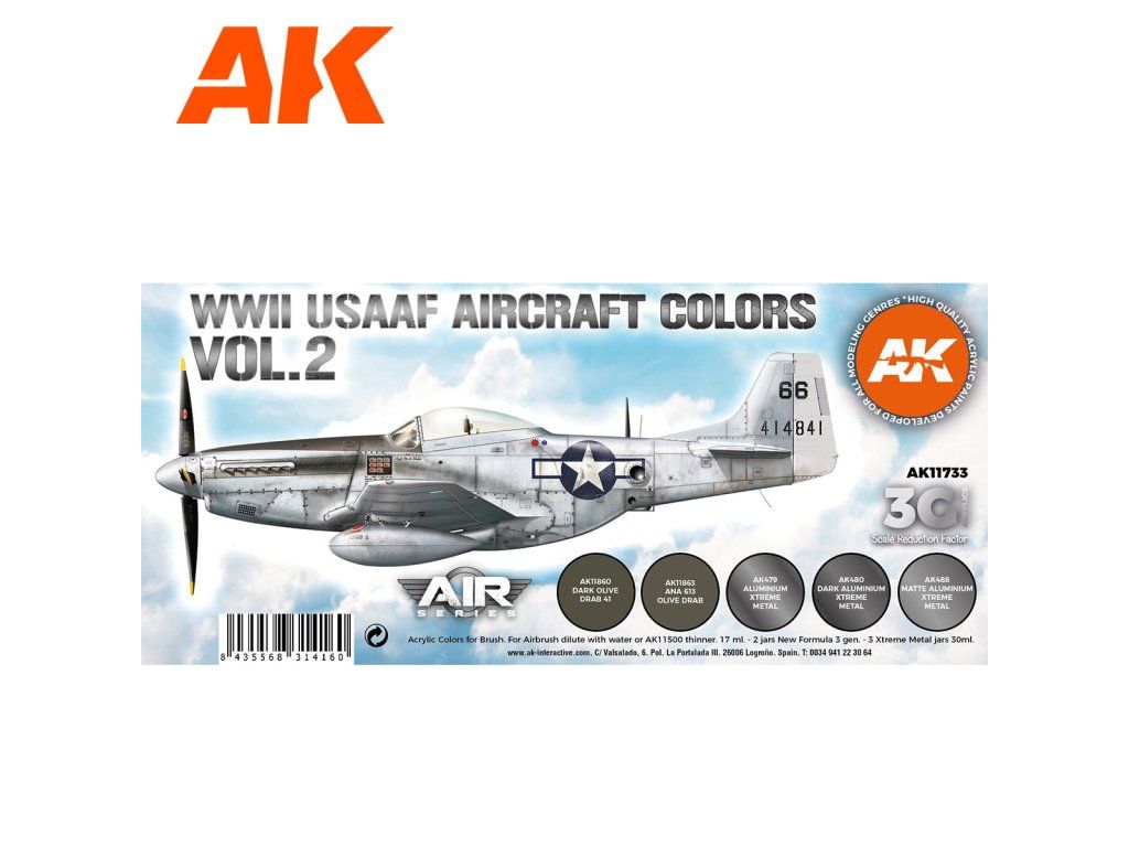 Sada akrylových barev AK-Interactive 3. generace vhodných pro stříkání airbrushem nebo malování štětcem. Sada je vhodná pro namalování ale nastříkání letadel americké US Air Force z druhé světové války.