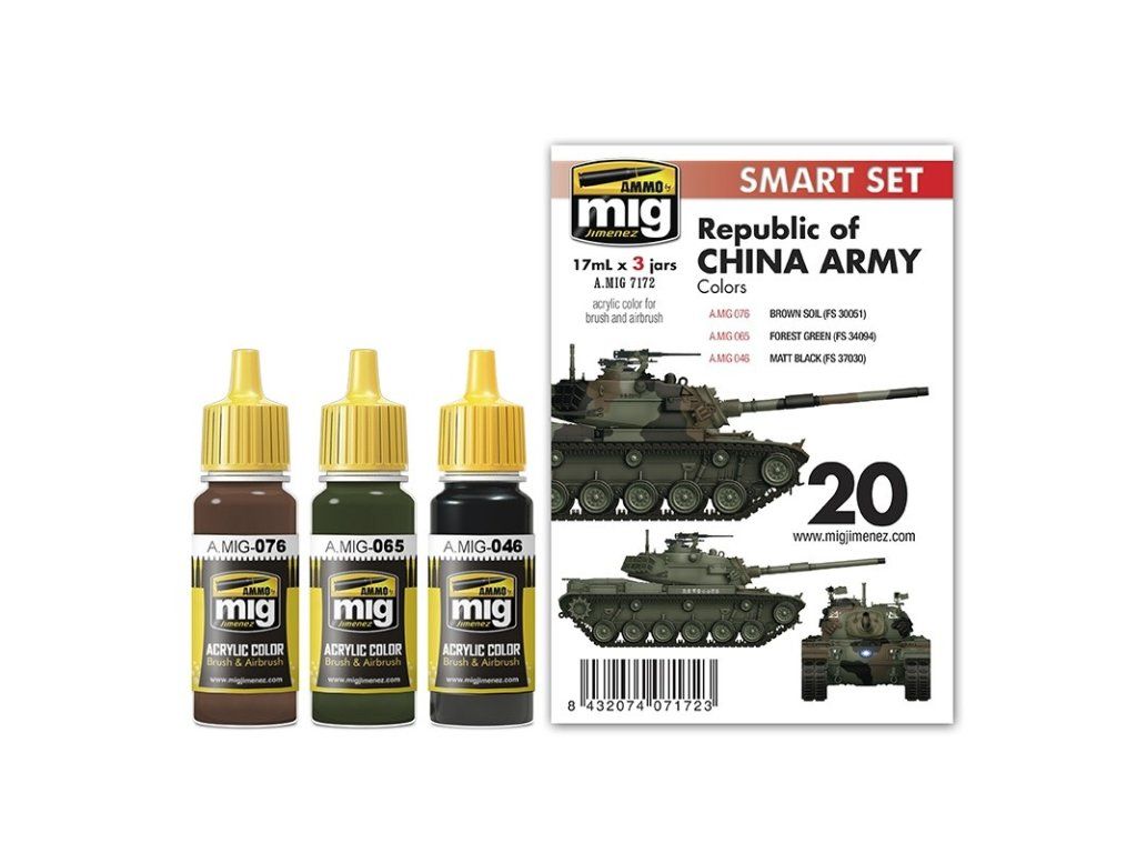 Sada modelářských akrylových barev značky Ammo určená pro nabarvení nebo nastříkání modelů vojenské techniky ve službách Čínské armády.