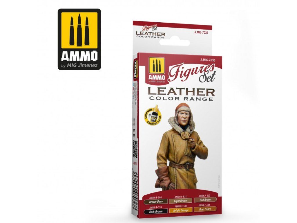 Sada modelářských akrylových barev značky Ammo určená pro nabarvení nebo nastříkání koženého povrchu na figurkách.