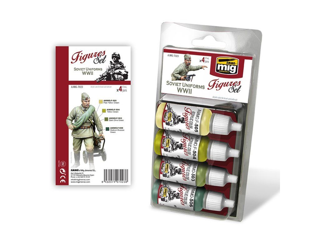 Sada modelářských akrylových barev značky Ammo určená pro nabarvení nebo nastříkání figurek uniforem sovětských vojáků ze 2. světové války.