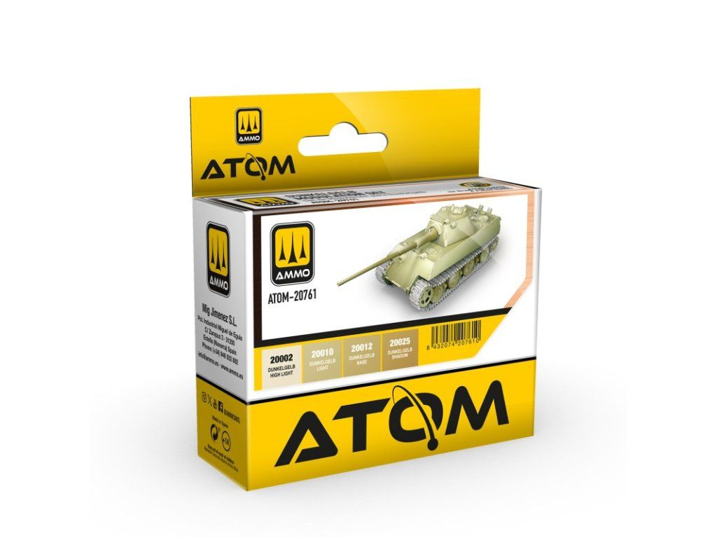 Nová revoluční série modelářských akrylových barev ATOM by AMMO, která spojuje 20 leté zkušenosti s barvami do jedné 20ml lahvičky. Barvy lze použít k malování a stříkání všech typů modelů nebo diorám, bez ohledu na jejich materiál, ať už je to plast, pryskyřice, fotolepty, kov, dřevo, pěna, tmel apod. Jsou ideální pro použití na modely, jako jsou vojenská vozidla, letadla, civilní vozidla, železniční modely, sci-fi, lodě, ponorky, diorámy, figurky, wargamingové a stolní hry a dokonce i modely na dálkové ovládání a autodráhová autíčka.