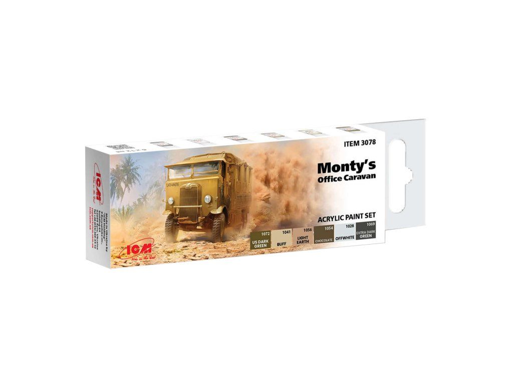 Sada modelářských akrylových barev značky ICM určená pro nabarvení nebo nastříkání modelu Montgomeryho mobilní kanceláře z druhé světové války.