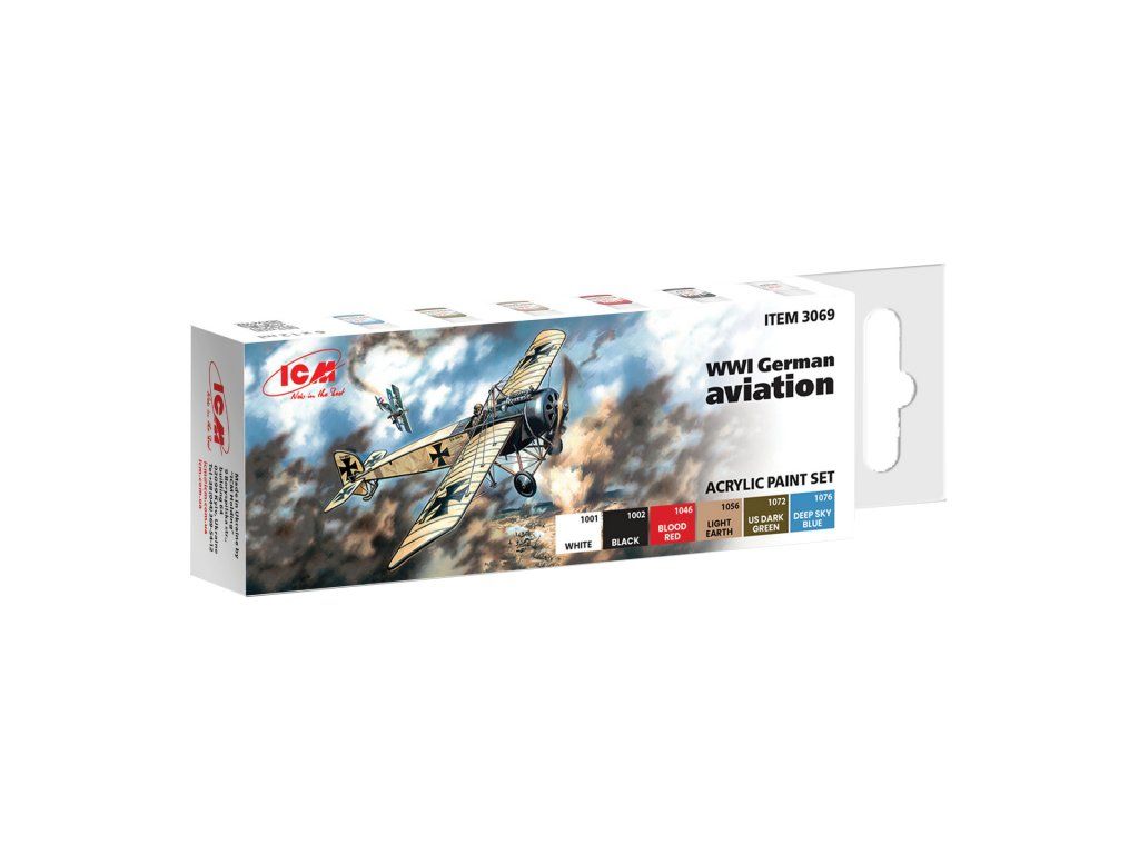 Sada 6 modelářských akrylových barev značky ICM určená pro nabarvení nebo nastříkání modelů německých letadel z první světové války.