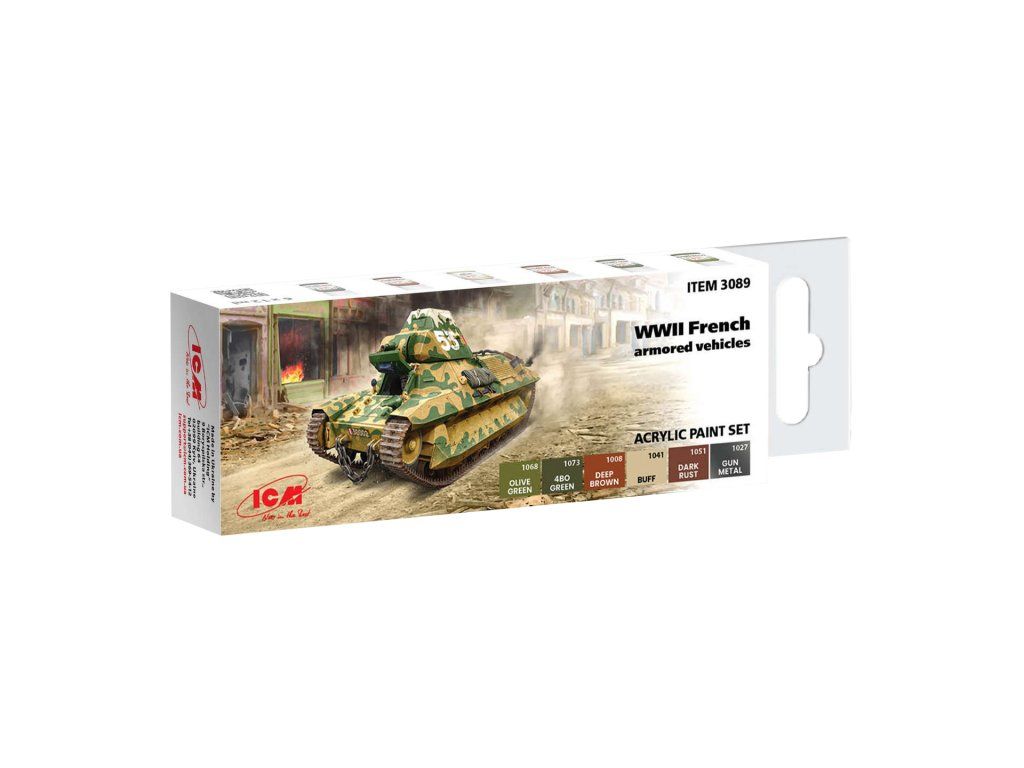 Sada modelářských akrylových barev značky ICM určená pro nabarvení nebo nastříkání modelů francouzských obrněných vozů ze 2. světové války.
