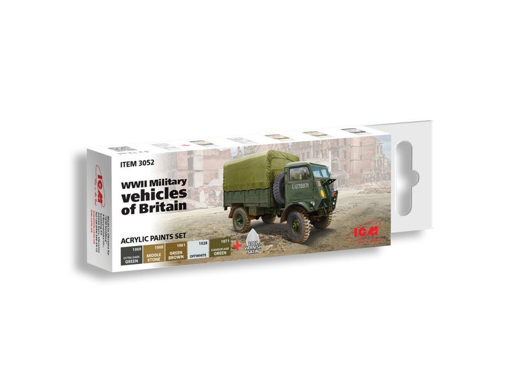 Sada modelářských akrylových barev značky ICM určená pro nabarvení nebo nastříkání modelů britských vojenských vozů ze 2. světové války.