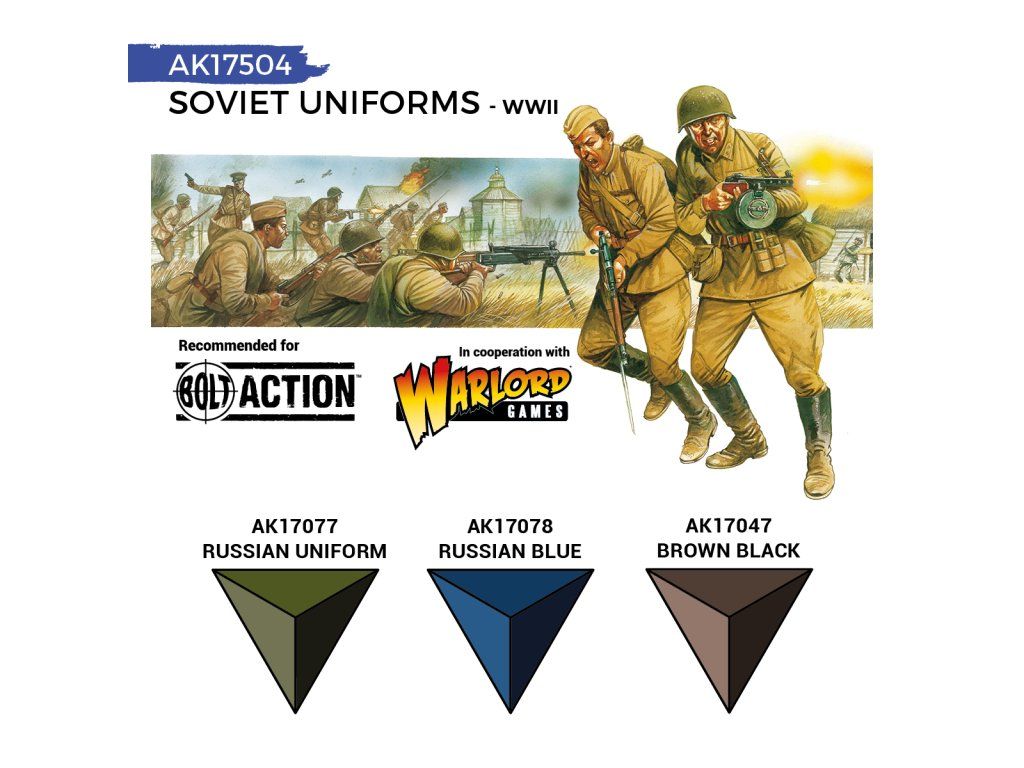 Sada 3 modelářských akrylových barev značky AK Interactive určená pro nabarvení nebo nastříkání uniforem sovětských vojáků ze 2. světové války.