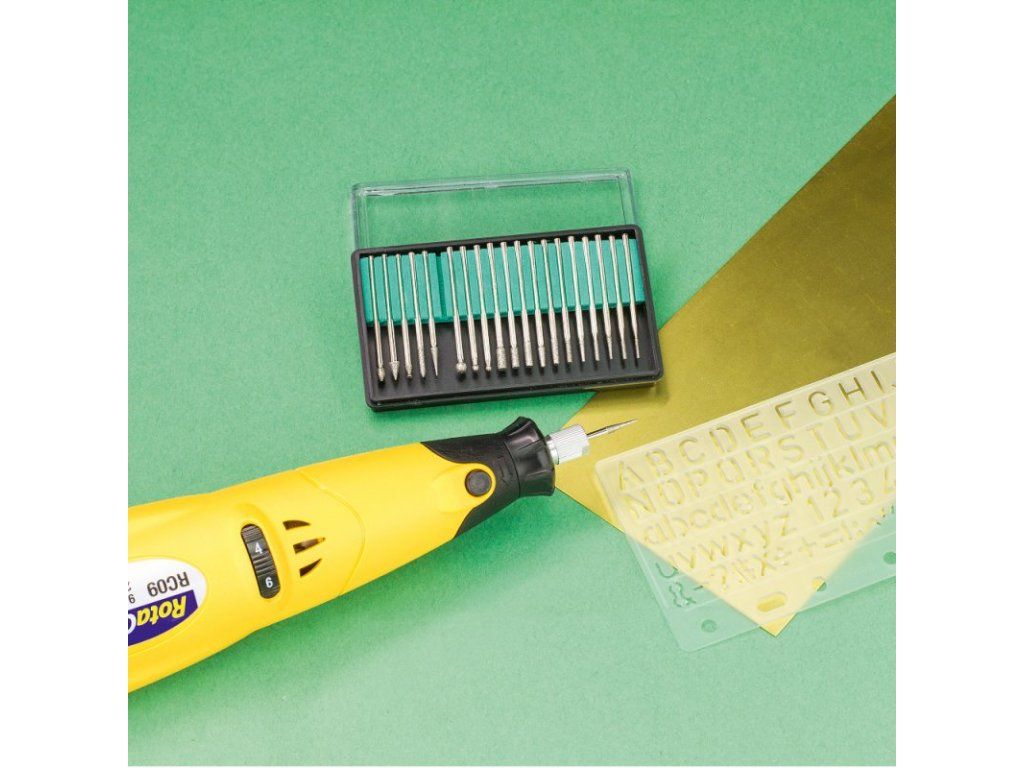 Sada diamantových gravírovacích nástrojů připevněných na 2,35 mm hřídele. Vhodné pro keramiku, kov, kámen, plasty a sklo. Může být použit v ručních nebo rotačních nástrojích.