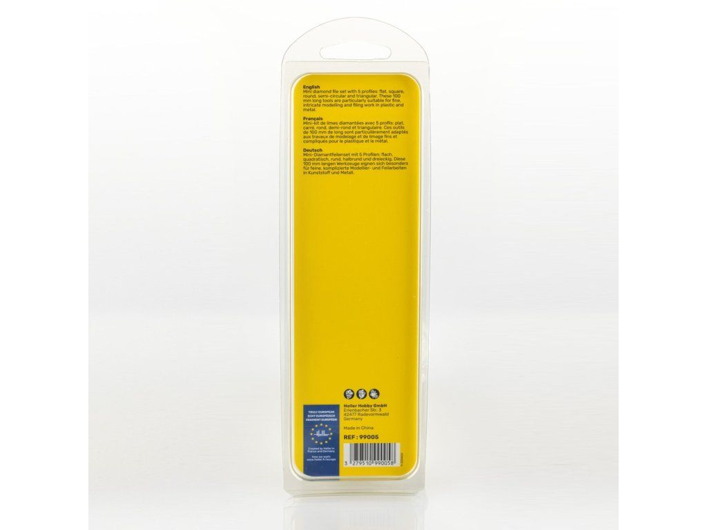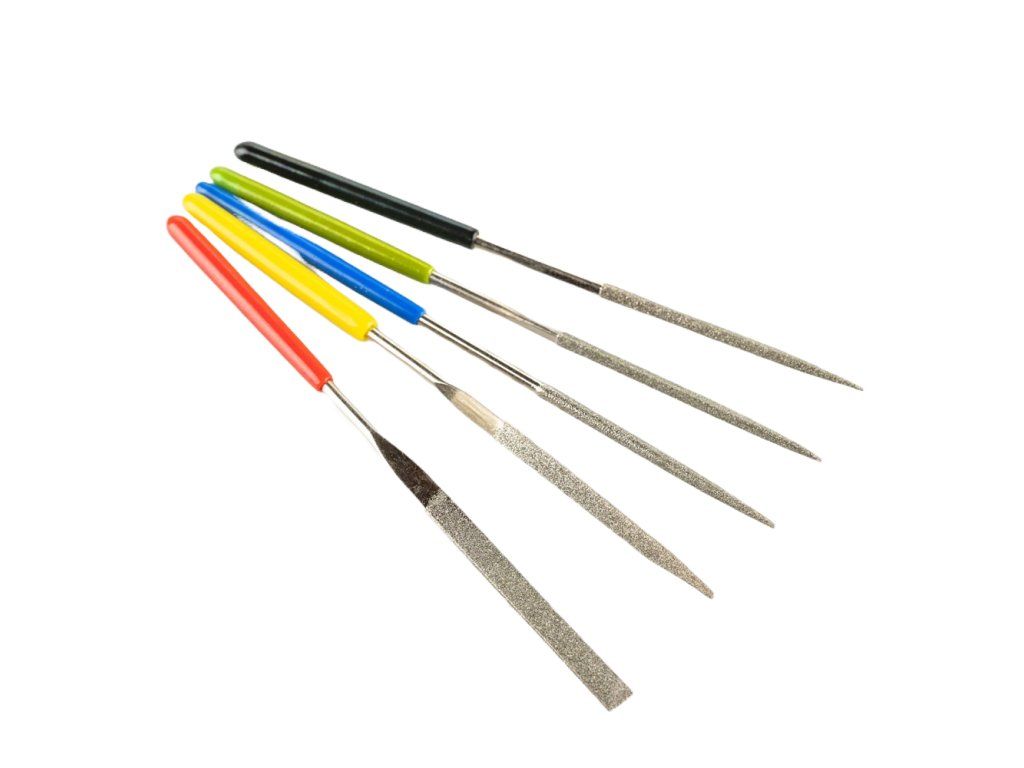 Sada mini diamantových pilníků s 5 profily: plochý, čtvercový, kulatý, půlkruhový a trojúhelníkový. Vhodné pro broušení plastů a kovů.