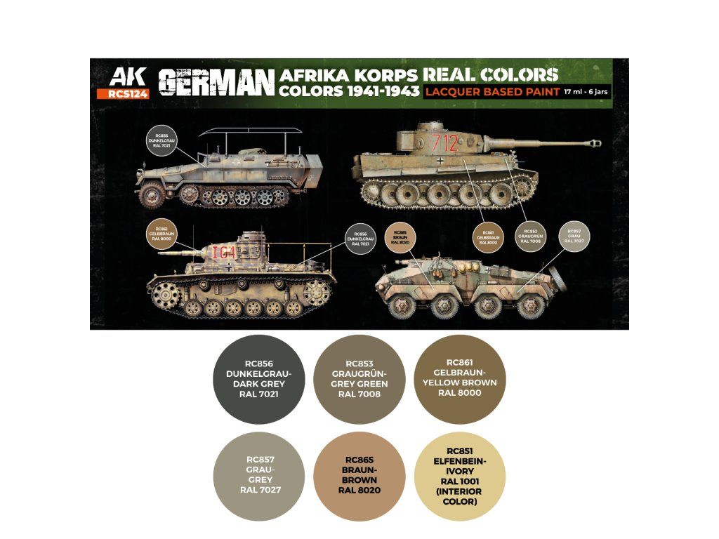 Sada modelářských lacqerových barev Real Colors značky AK Interactive určená pro nabarvení nebo nastříkání modelů německých vojenských vozů z bojů v Africe, které se odehrávaly během druhé světové války.