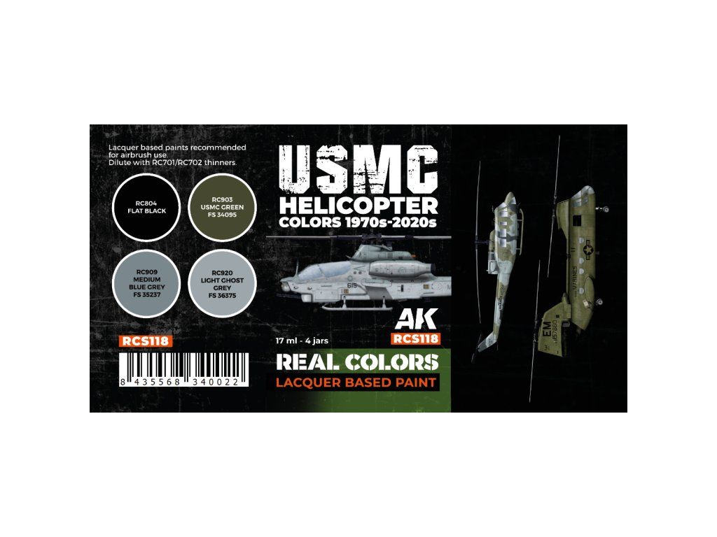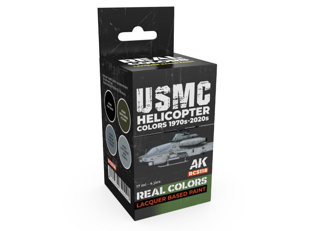 Sada lacquerových barev AK-Interactive Real Colors vhodných pro stříkání airbrushem nebo malování štětcem. Sada je vhodná k namalování ale nastříkání helikoptér United States Marine Corps ze 70. let až po současnost.
