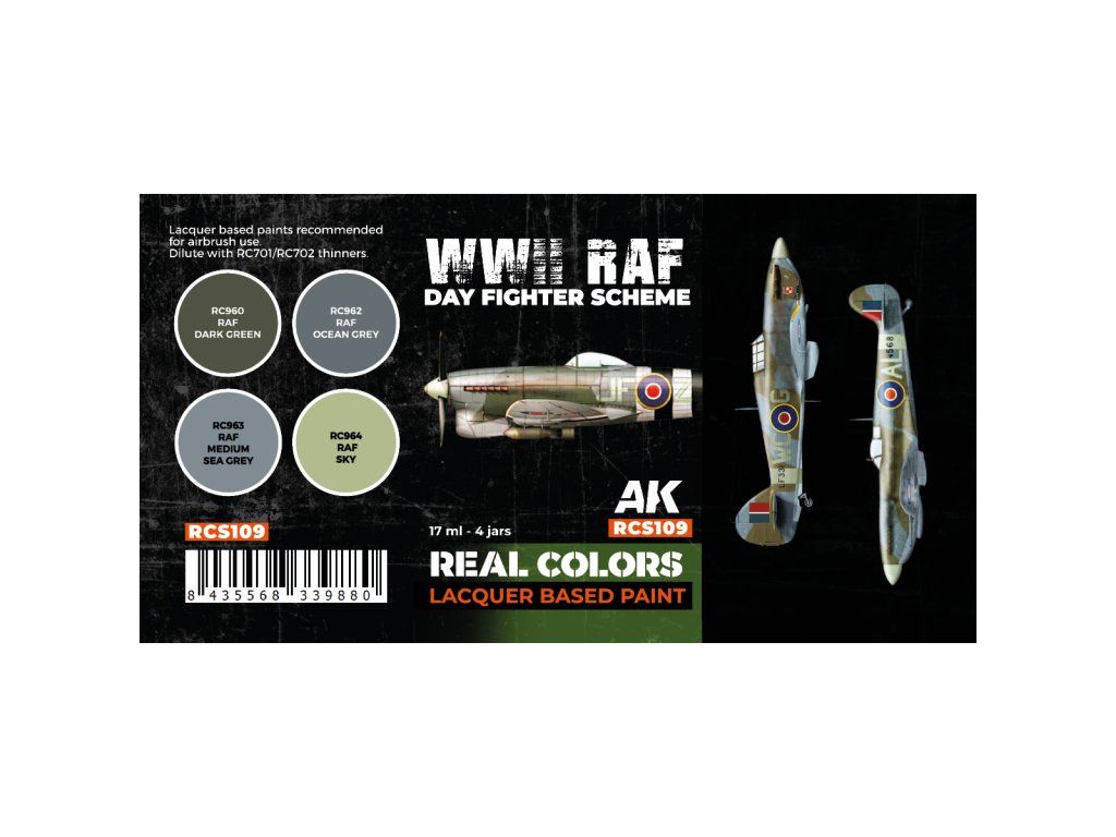 Sada lacquerových barev AK-Interactive Real Colors vhodných pro stříkání airbrushem nebo malování štětcem. Sada je vhodná k namalování, ale nastříkání britských stíhacích letadel z druhé světové války.