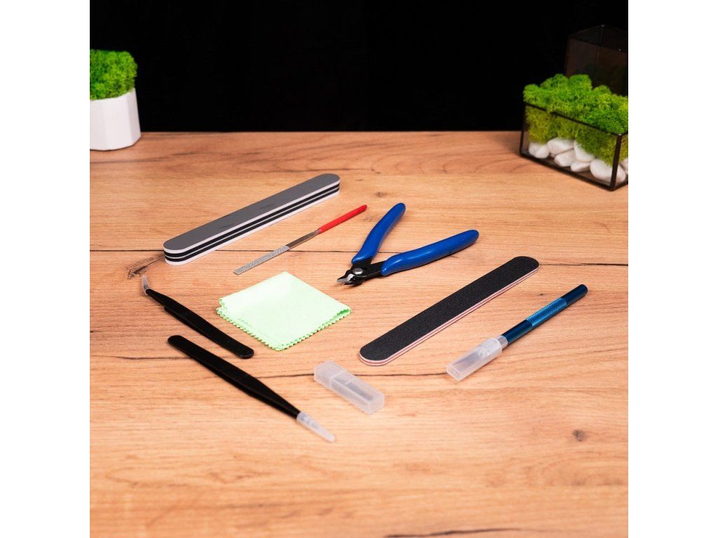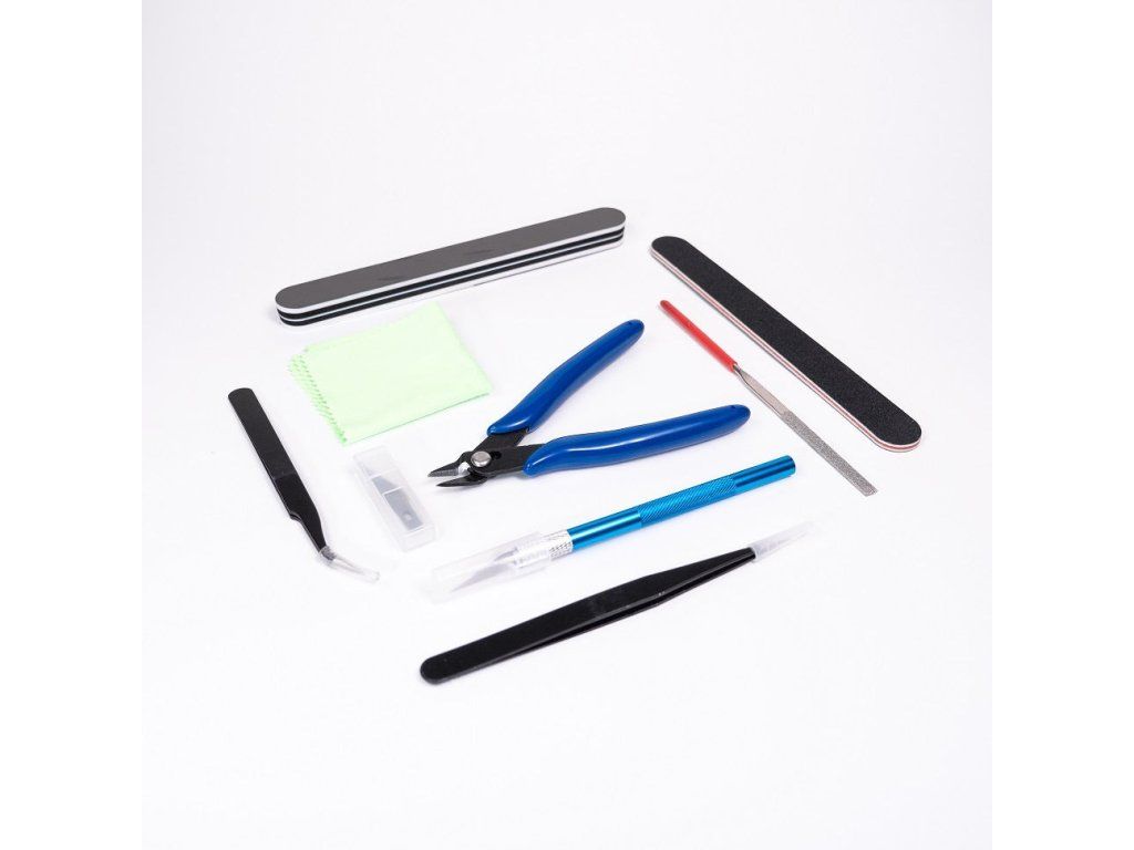 Základní sada modelářského nářadí určená pro všechny druhy modelářů nebo kutilů. Obsahuje všechny potřebné nástroje pro opracování a manipulaci dílů stavebnice nebo kousku, na kterém právě pracujete. Sada se dodává v plastovém pouzdře.
