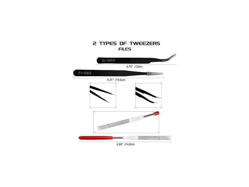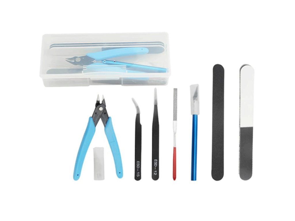 Sada obsahuje: Rovnou a zahnutou pinzetu, pilník, modelářský nůž a čepele, dva pilníky a vyštipovací kleště.