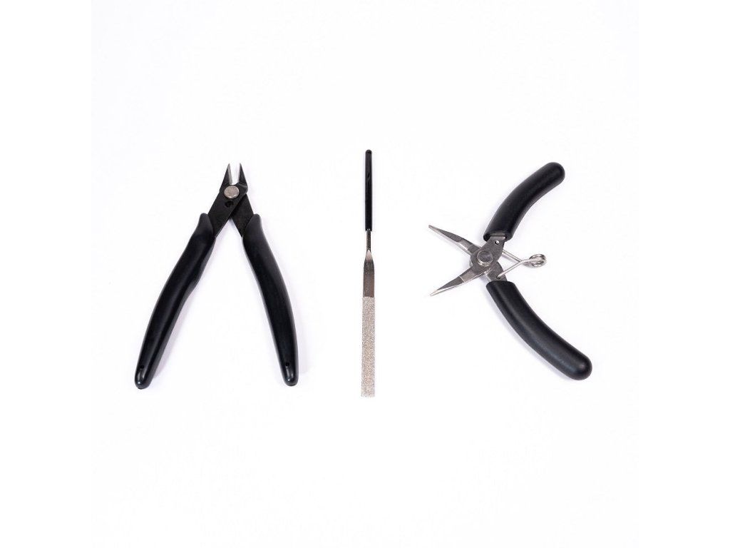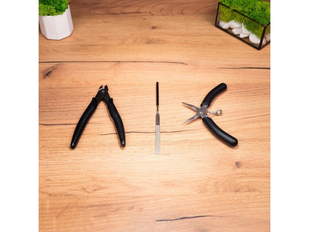 Sada obsahuje: Vyštipovací kleště, pilník, prodloužené kleště (k ohýbání)