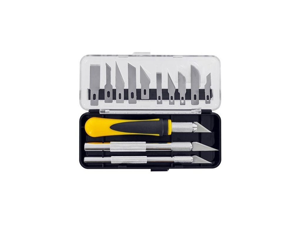 Praktická sada modelářských nožů v pouzdře s náhradními čepelemi. V sadě jsou všechny tři velikosti držadel, tenká, střední a tlustá a 13 čepelí.
