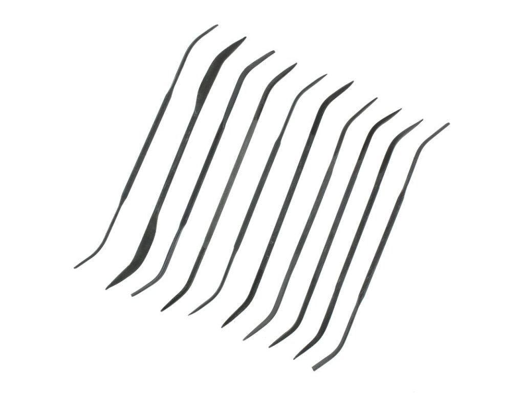 Sada speciálních jehlových pilníků se zahnutou pracovní částí as různými tvary průřezů pro všestranné použití v modelářství, domácím hobby ale také při profesionální práci.