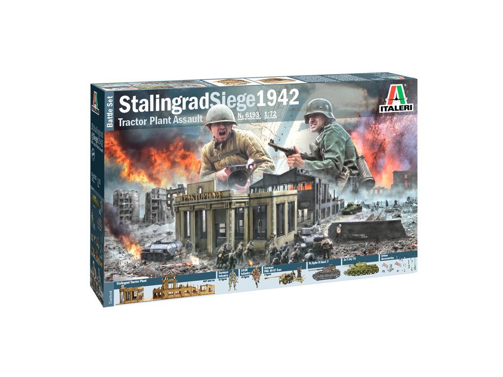 Stavebnice plastikového modelu diorámy zobrazující jednu z nejkrvavějších a nejbrutálnějších bitev v historii - Bitvu o Stalingrad, která změnila chod 2. světové války. Balení obsahuje stavebnice modelů tanků, figurky vojáků sovětské a německé armády a ruin budov Stalingradu.