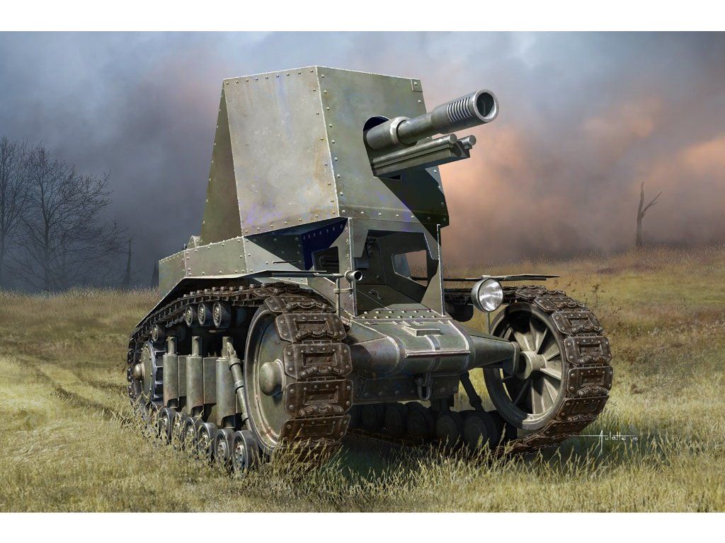 Stavebnice plastikového modelu sovětské samohybné houfnice z období před 2. světovou válkou.
