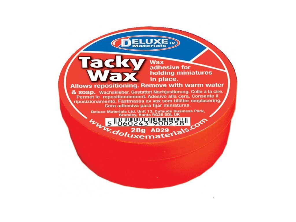 Tacky Wax je lepicí vosk. Skvěle se hodí k připevnění menších dílů modelu, k upevnění postaviček v modelové železnici/diorámu apod. Speciální složení zaručuje trvalou lepivost, takže lze díly/postavičky opakovaně přemísťovat bez nutnosti nanášení nového lepidla. Zbytky lepícího vosku lze smýt teplou vodou.
