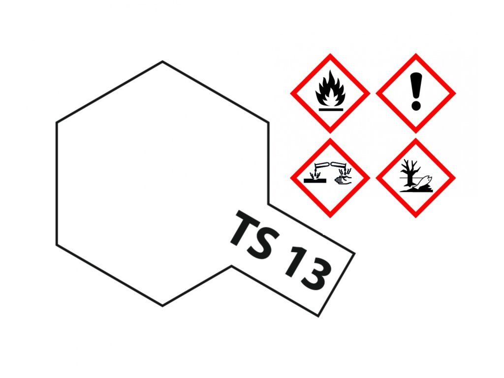 Tamiya TS-13 je syntetický lak ve spreji s lesklým finišem. Vytvrzuje v krátké době a je užitečný pro velké plochy. Lak nereaguje s akrylovými nebo emailovými barvami či produkty na weathering. Každá plechovka obsahuje dostatek laku na úplné pokrytí 2 nebo 3 karoserií modelů aut v měřítku 1/24.