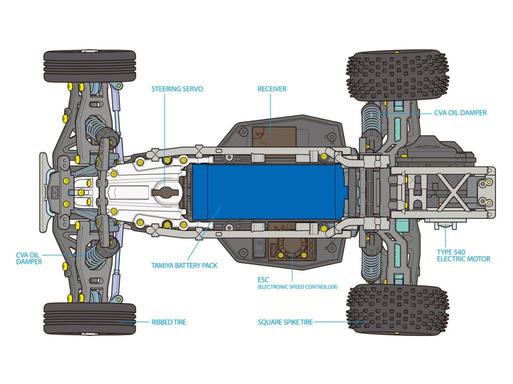 Nový DT-04 - 2WD buggy podvozek s pohonem zadních kol ve srovnání se svými předchůdci poskytuje lepší výkon v terénu a bohaté možnosti nastavení. Z podvozků DT-02 a DT-03 jsou také sdílena přední a zadní ramena zavěšení, převody a převodovka. Kromě toho je pro tuto novou iteraci možné použít mnoho dílů z podvozků DT-02 a DT-03.