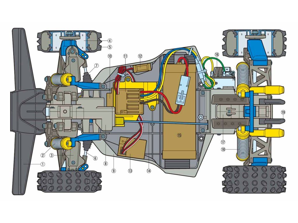 Obsah balení: Stavebnice RC modelu buggy, 540-Type Torque Tuned stejnosměrný motor, ESC regulátor, lexanová karoserie.