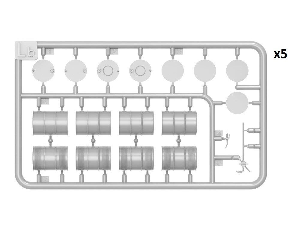 Stavebnice plastikového modelu sady amerických palivových sudů o objemu 55 galonů (208l) z období druhé světové války.
