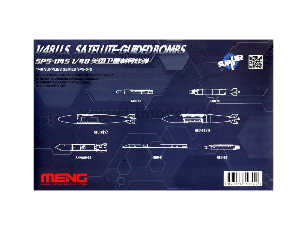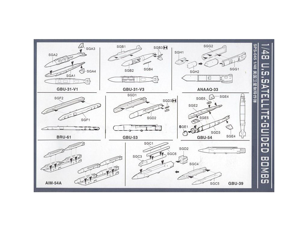 Stavebnice sady plastikových modelů amerických satelitně naváděných bomb. Určeno jako doplněk a výzbroj pro moderní letadla v měřítku 1/48.