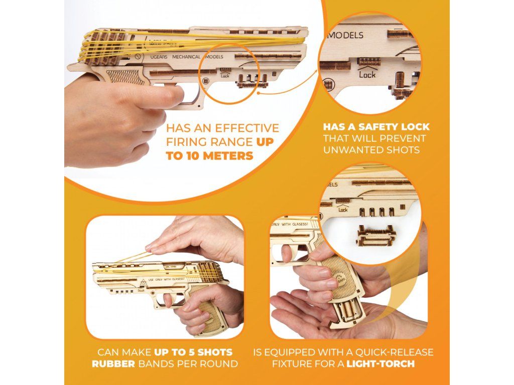 Dřevěné stavebnice mechanických modelů UGEARS jsou určeny pro děti i dospělé. Všechny díly jsou precizně vyřezány přesnou laserovou technologií z kvalitní překližky. Přesnost dílů zaručuje pohodlné sestavení i složitějších typů modelů. Skoro všechny modely UGEARS jsou nějakým způsobem funkční, ať už ve formě pohyblivých částí, nebo díky pryžovému pohonu. Modely jsou opakovaně rozebíratelné, pro sestavení se nepoužívá lepidlo.