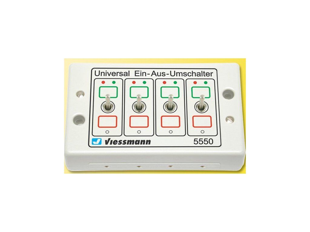 Jednoduchý univerzální ovládací pult s páčkovými přepínači pro snadné přepínání 4 okruhů osvětlení, světelných návěstidel a jiných prvků s nepřetržitým proudem. Změnitelný na dva 2pólové přepínače pro regulaci napětí pomocí dodané spojovací páky.