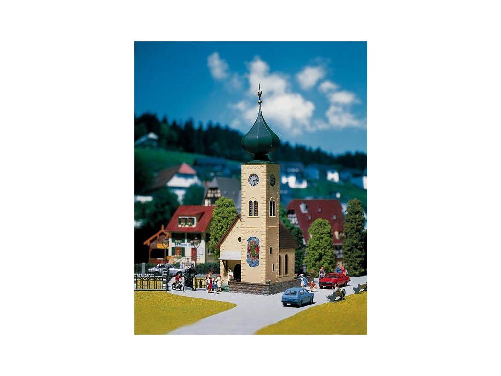 Stavebnice plastového modelu venkovského kostela menší velikosti s typickou cibulovou střechou, jak je často vidět iv našich vesnicích. Vhodný do železniční diorámy s vesnickou zástavbou nebo do malého městečka.