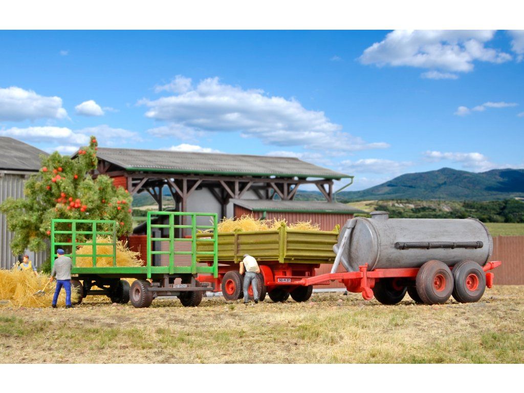 Stavebnice plastikového modelu sady vleček určených pro traktor. Vhodné do diorámy nebo vláčkové krajinky.