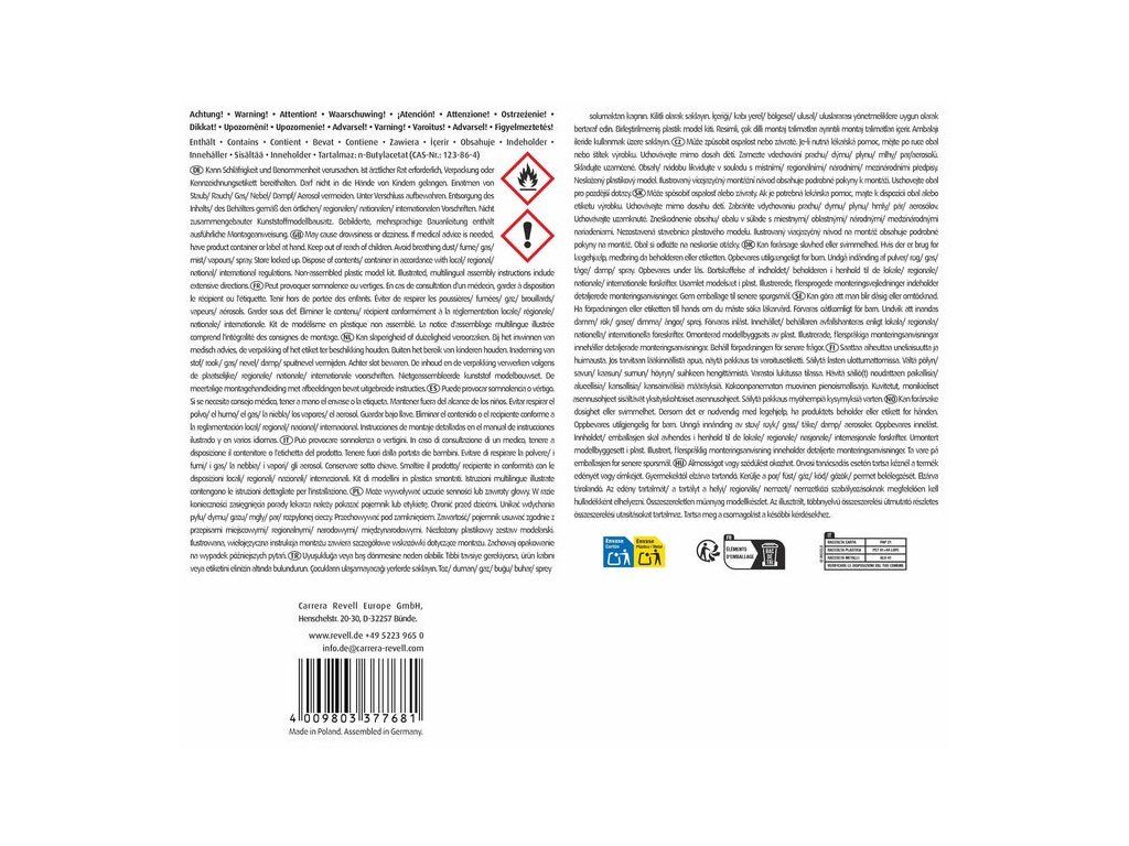 Plastiková stavebnice, obsahuje nesestavené a nenabarvené díly. V některých typech stavebnic jsou navíc kovové, PUR a gumové díly. Pozor, obsahuje malé díly, uchovávejte mimo dosah dětí do 3 let. Nevhodné pro děti do 14 let.