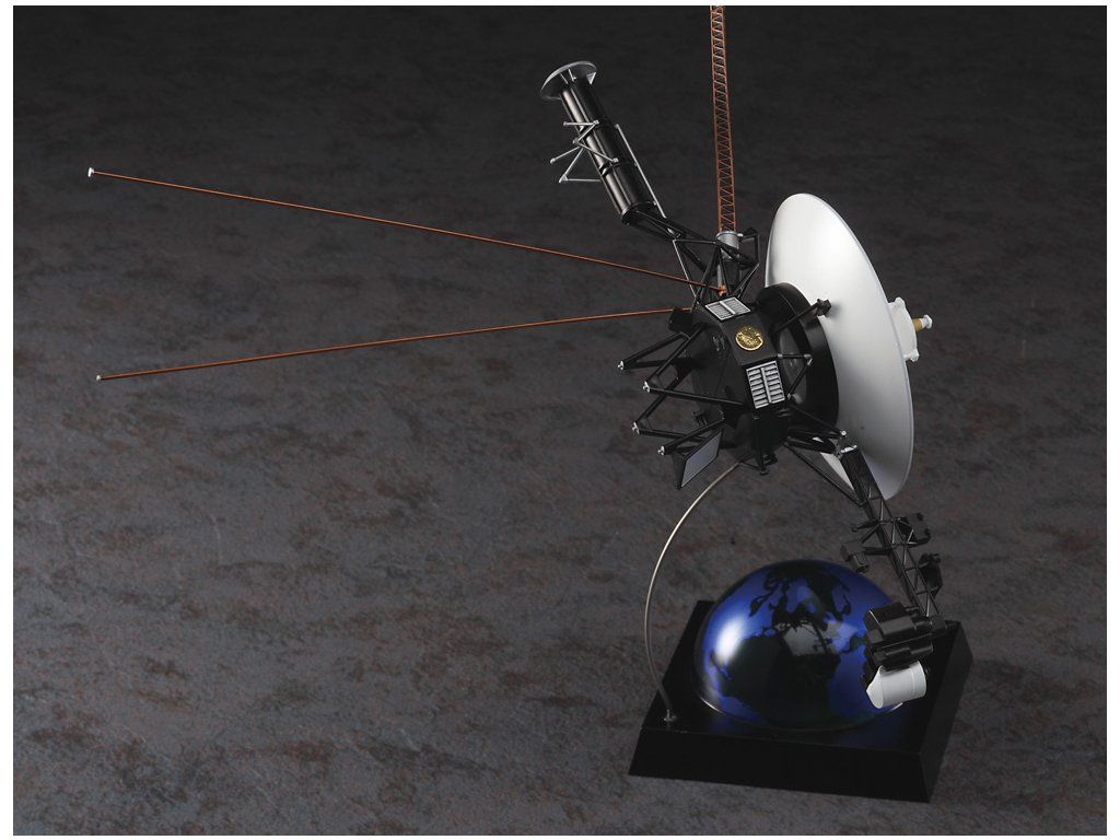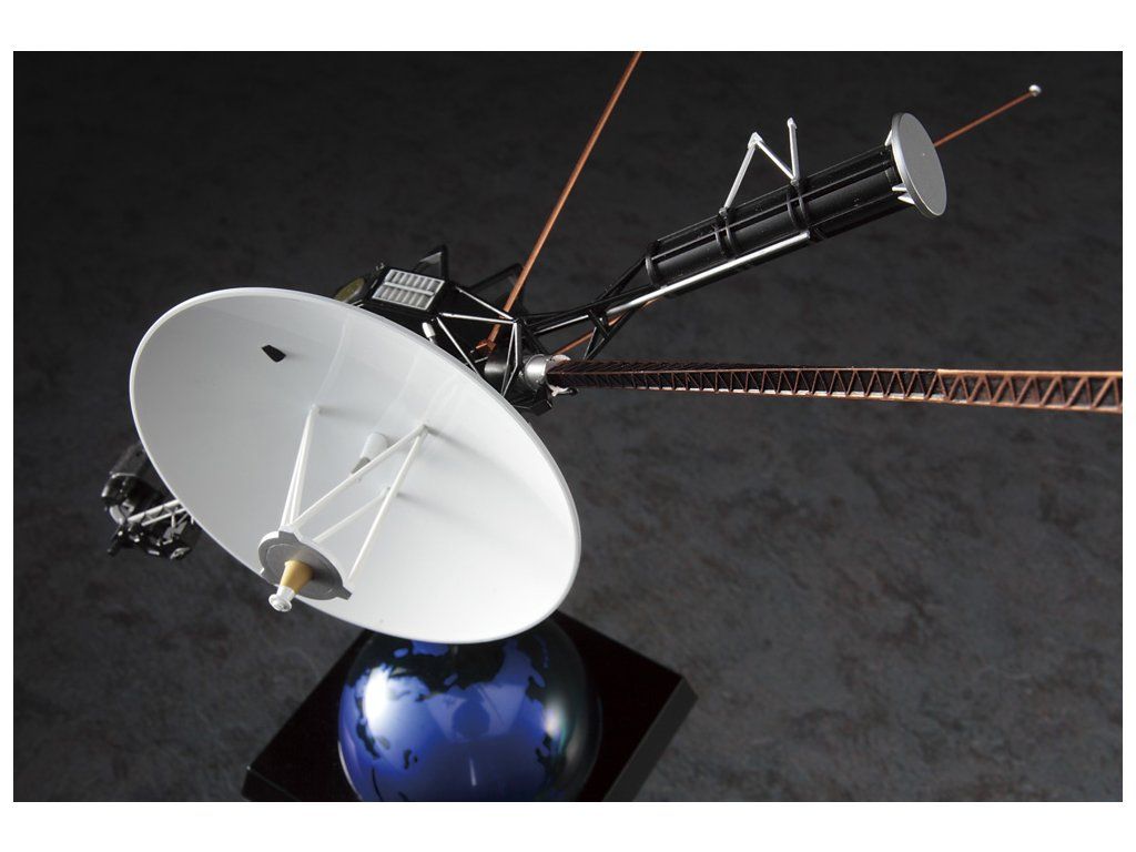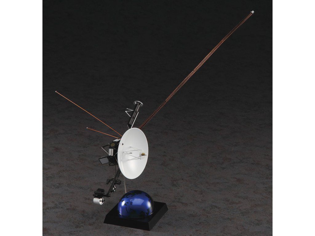 Stavebnice plastikového modelu meziplanetární kosmické sondy Voyager. Součástí balení je také nášivka s emblémem mise Voyager.