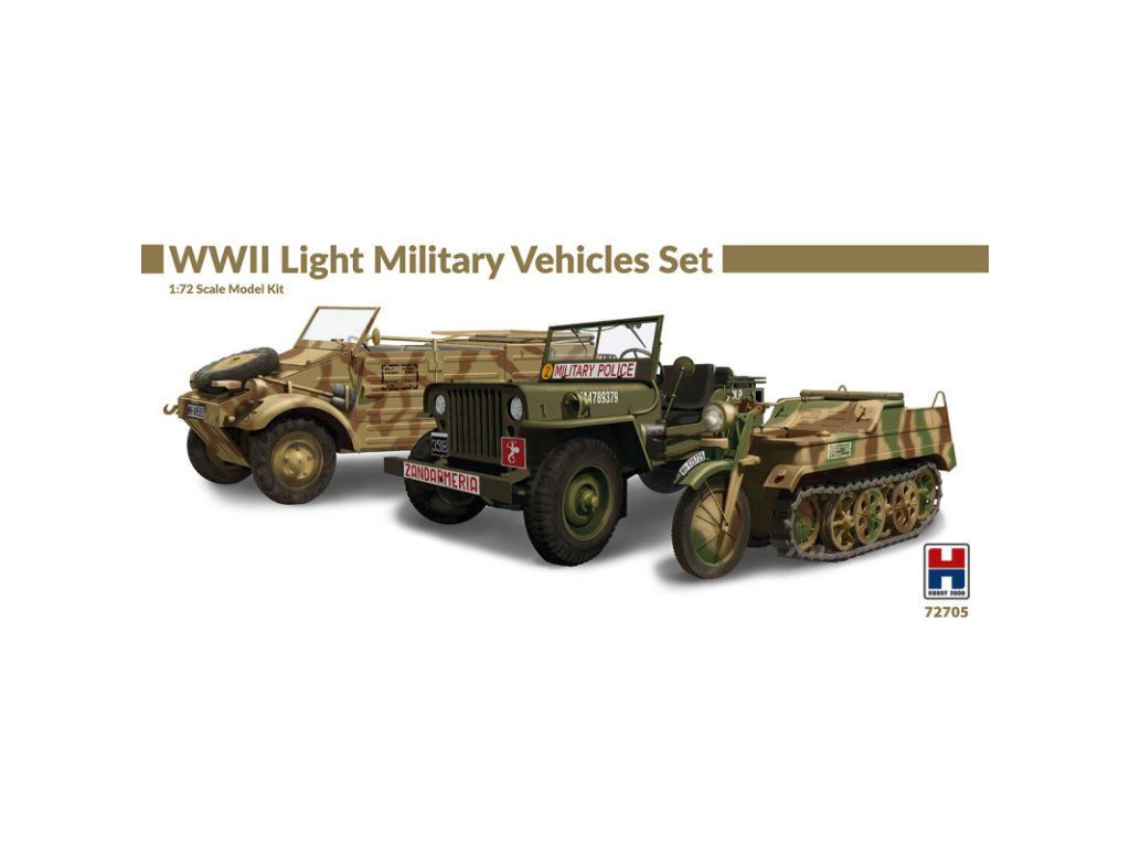 Stavebnice plastikového modelu sady lehkých vojenských vozů z druhé světové války. Sada obsahuje americký Jeep Willis, německou polopásovou motorku Kettenkraftrad a obrněný vůz Kubelwagen.